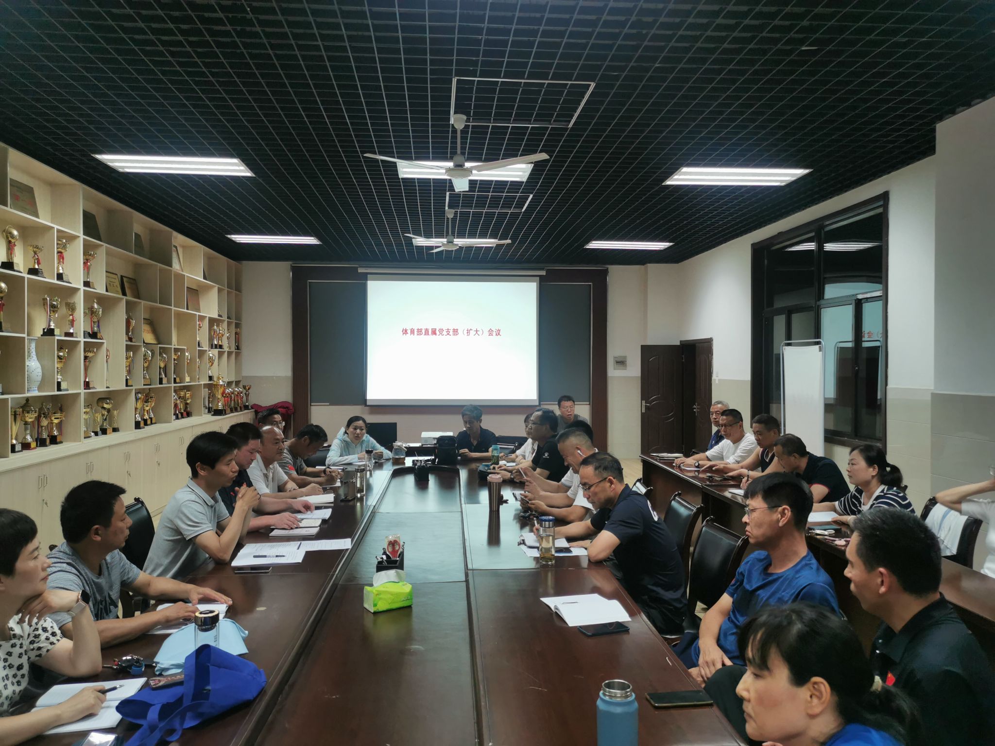 本网讯 7月5日下午,体育部直属党支部在游泳馆一楼会议室召开党员(扩大)会议,体育部全体党员、教职工参加会议。会议由党支部副书记黄庆华主持。