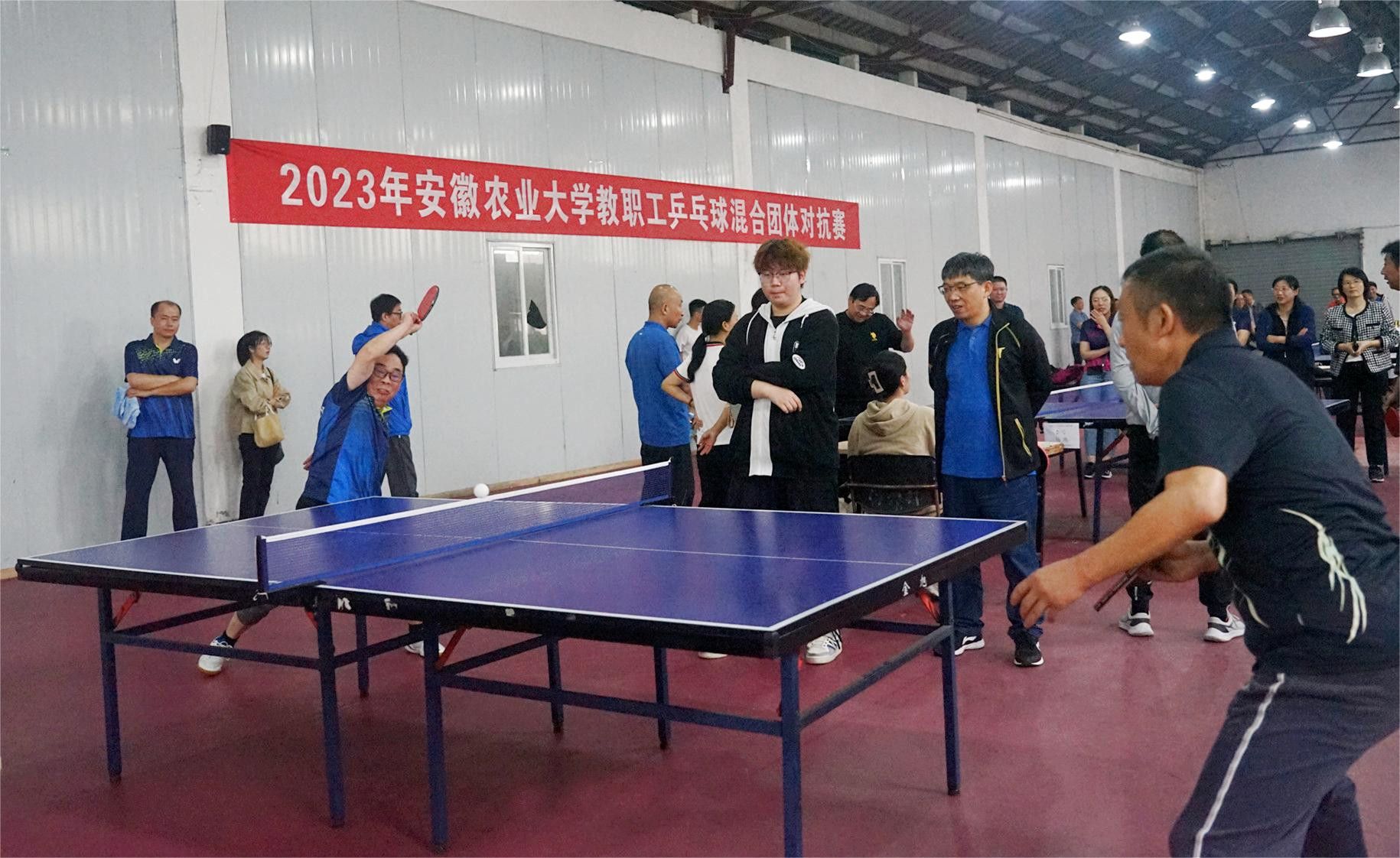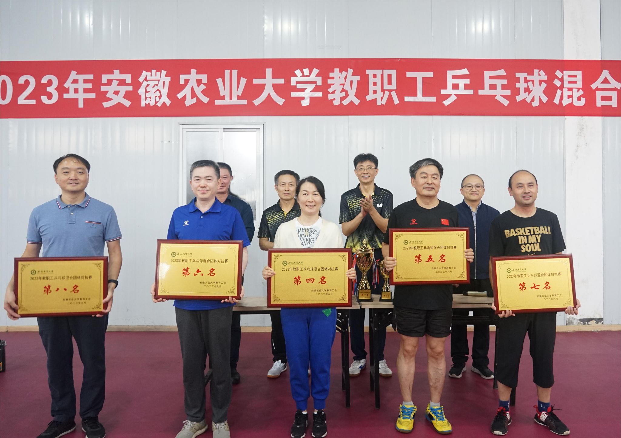 本网讯 9月23日-24日,我校2023年教职工乒乓球混合团体比赛在第三运动场举行。全校共22支代表队、200余名运动员参加比赛。校党委常委、副校长韩军参加比赛并出席闭幕式,为获奖队伍颁奖。经过62场激烈的角逐,最终外国语学院摘得桂冠,茶与食品科技学院和机关一工会分别获得亚军和季军,林学与园林学院、经济管理学院、资源与环境学院、机关二工会和机关三工会分别取得第四名至第八名的好成绩。