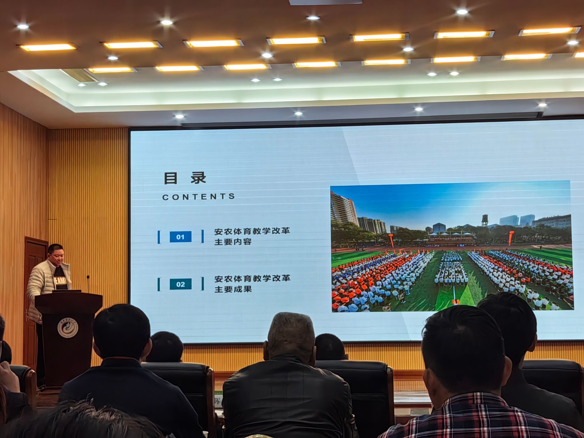 会议期间,体育部副主任尹维增作了题为《塑体铸魂 五育融通 多维度提升体育育人质量》专题报告,从学生体质测试、体育场馆建设、课余体育活动、训练竞赛荣誉、社会服务实践等五个方面介绍了我校在“教、练、赛”并举、“研、改、策”相济等方面的具体做法,以及我校体育教学改革所取得的成果,受到参会代表的一致好评。