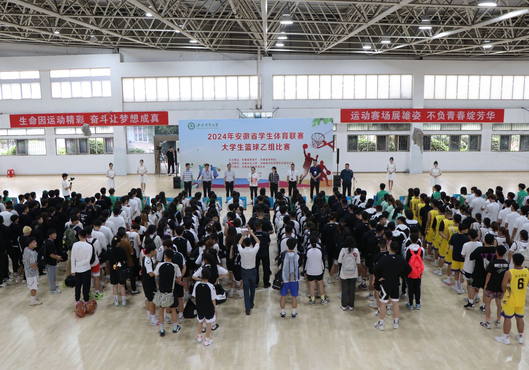 本网讯 5月19日上午,由安徽省教育厅和安徽省体育局主办,我校承办的2024年安徽省学生体育联赛大学生篮球赛(乙组)比赛在我校体育馆开幕,校党委常委、副校长李红,省教育厅体卫艺处四级调研员金威威,省学校体育协会副理事长兼秘书长马纯出席开幕式。全省28所院校、35支队伍的领队、教练员、运动员,全体裁判员、志愿者以及工作人员等参加开幕式,开幕式由我校体育部负责同志主持。
