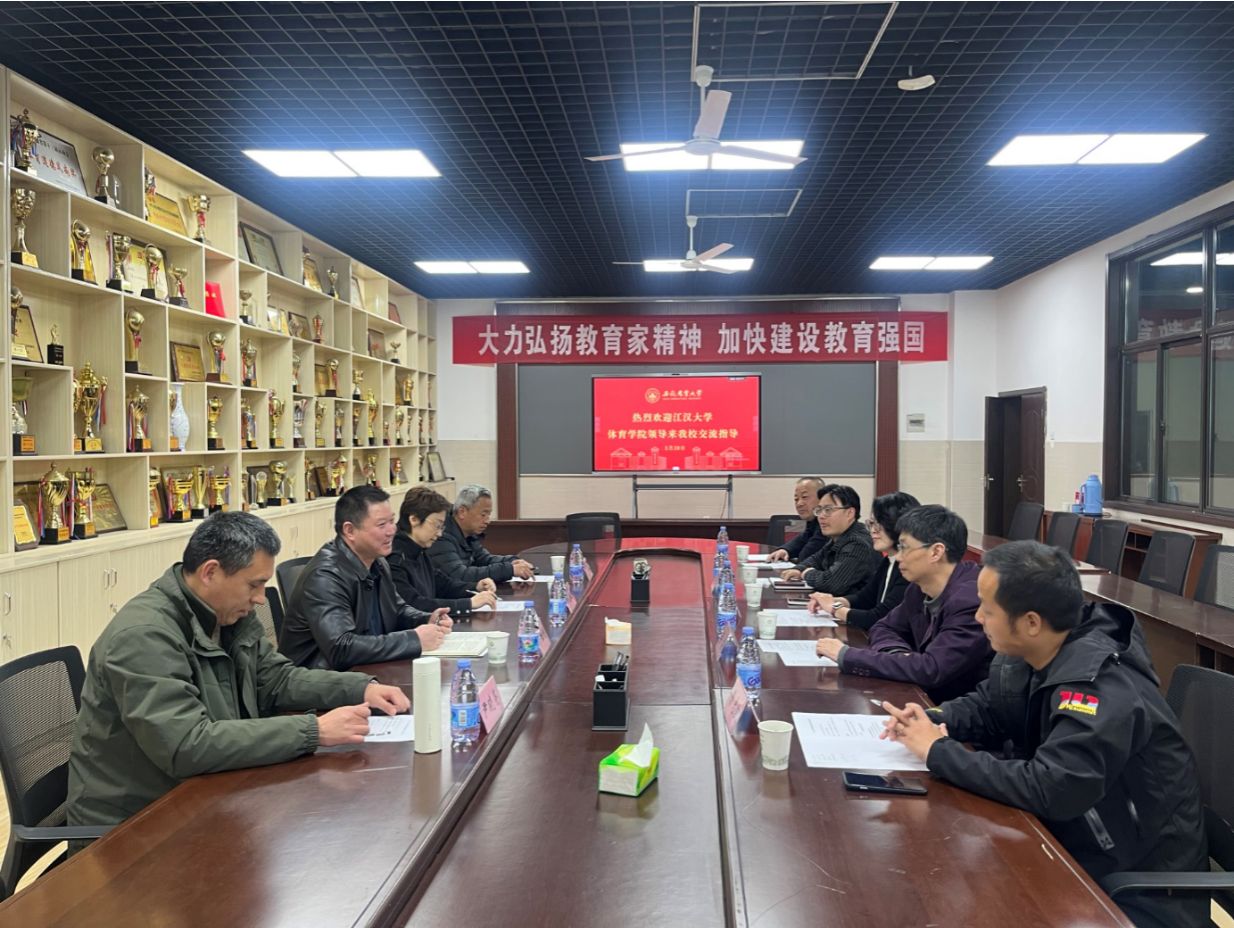 本网讯 3月20日下午,江汉大学体育学院副院长李奕一行来校体育部交流调研体育工作。体育部主任尹维增主持调研座谈会,江汉大学体育学院和我校体育部相关同志参加座谈会。
