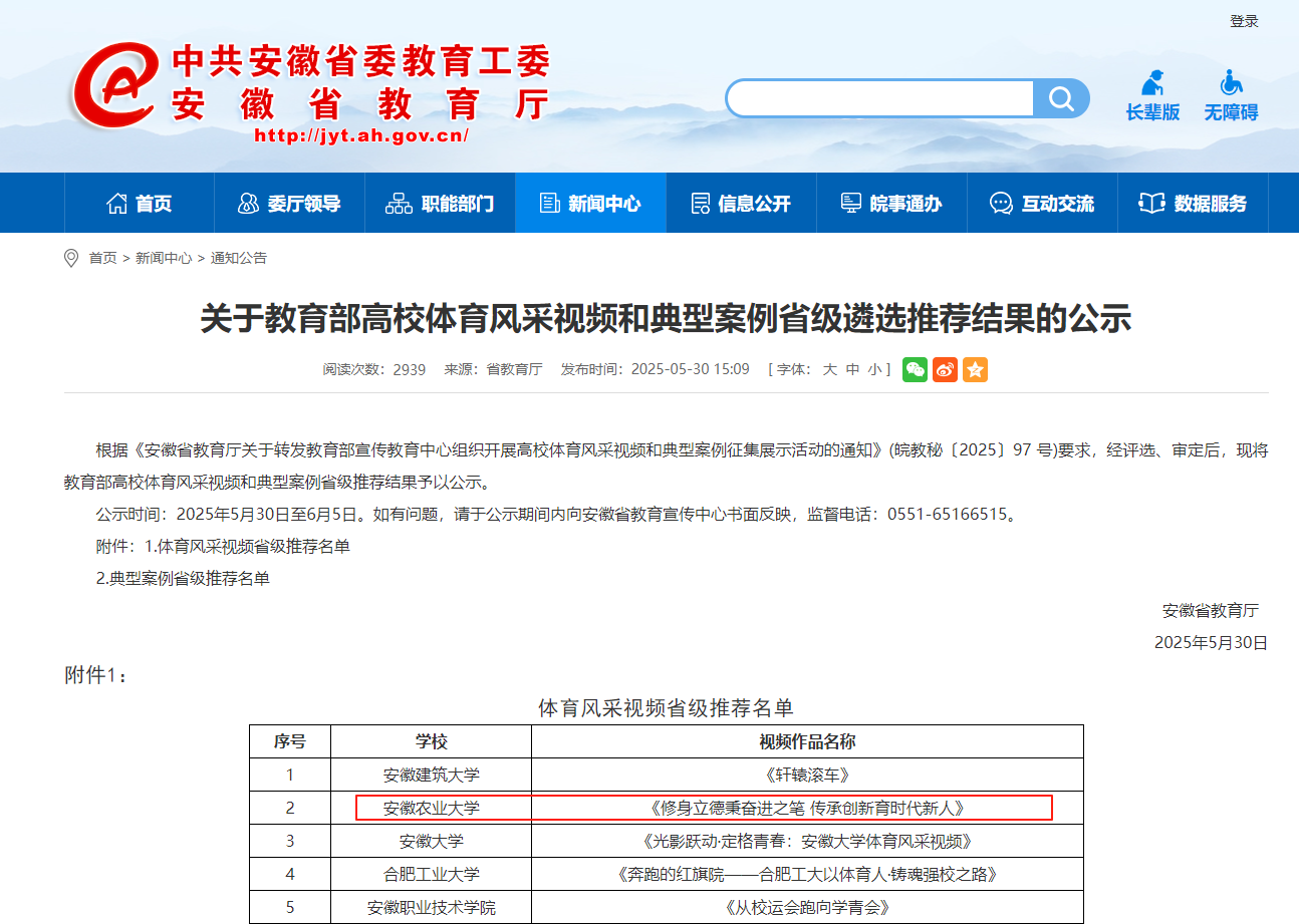 近日,经省教育厅评选、审定,我校体育风采视频《修身立德秉奋进之笔 传承创新育时代新人》和典型案例《生命安全教育融入高校体育课程的理论与实践》被推荐上报教育部。