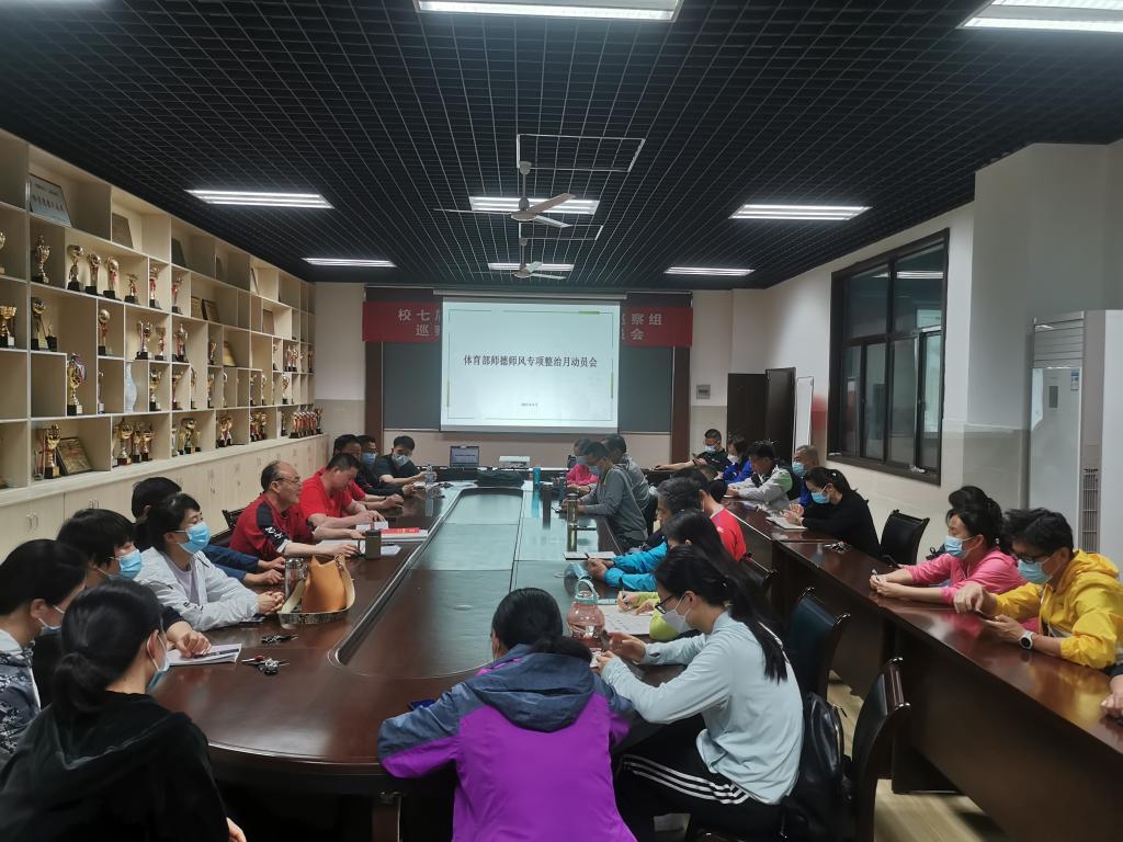 4月27日下午,体育部在游泳馆一楼会议室召开全体教职工会议,就师德师风专项整治月工作进行动员部署,会议由体育部主任李宏主持,体育部全体教职工参加了会议。