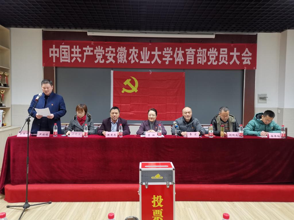 本网讯 1月15日下午14:30,中共安徽农业大学体育部党员大会在体育部第一会议室顺利召开。校党委常委、副校长李红、校纪委办邹兴业、党委组织部丁朝阳到会指导工作。体育部副主任兼直属党支部副书记尹维增主持会议。