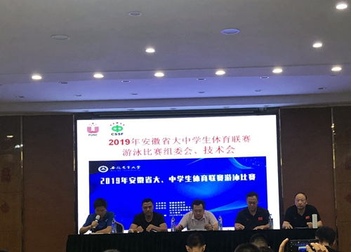 本网讯 9月26日晚,2019 年安徽省大、中学生体育联赛游泳比赛第一次组委会会议在泽丽大酒店会议室召,安徽省教育厅体卫艺处处长卢鹏,安徽省田径游泳运动管理中心青少部及社会活动部部长张健,安徽省教育厅体卫艺处主任丁仁能,安徽农业大学体育部主任陈有忠出席会议,各参赛代表队领队参会。