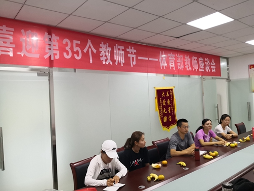 3、 9月10日下午,在体育部二楼党员活动室,举行了喜迎第35个教师节,体育部教师座谈会,座谈会以“不忘初心,牢记体育工作者的使命”为主题,各位老师踊跃发言,座谈会气氛热烈,与会教师纷纷表示要把教师工作厚植在爱国主义情怀中,牢记为广大师生员工健康服务的初心。(张燕中 通讯员:李和标)