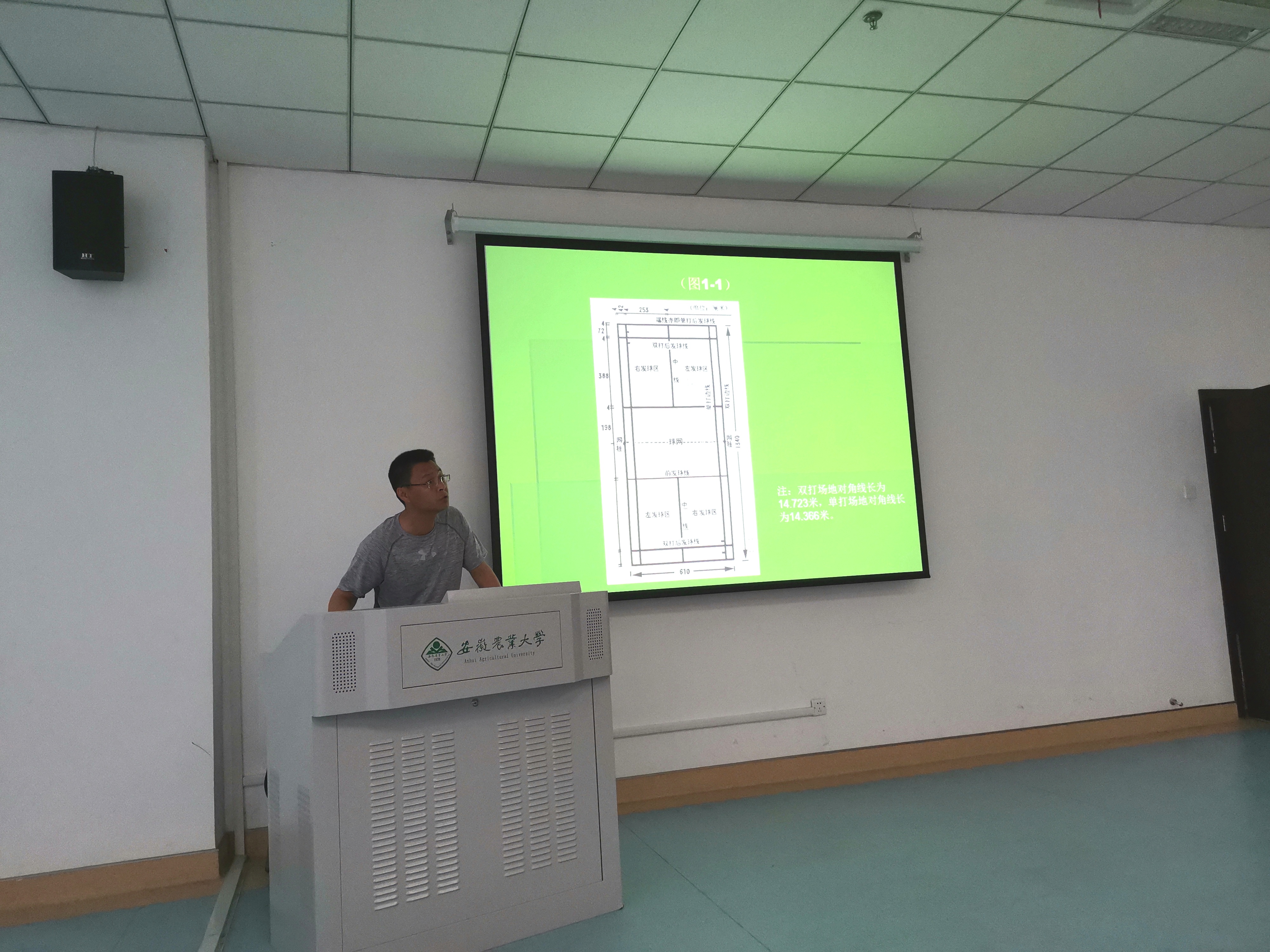 5月15日中午12:30——14:00,羽毛球裁判员培训班在校图书馆610教室顺利开班,羽毛球国家一级裁判员——毛迪老师为全体培训班学员讲解了羽毛球最新竞赛规则与裁判法的基本知识,并和学员们重点讨论、学习了国际羽联关于规则中新修改的部分;比如世界羽联确定了新的羽毛球发球规则,发球线被严格规定为不能超过1.15米。