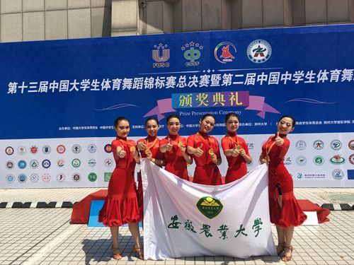 2017年12月在合肥举办的南区分站赛中,我校运动员赛前准备充分,信心满满,成功取得了南区分站赛大学生普通院校组6人组彝族拉丁第一名、佤族拉丁第一名、傣族华尔兹第二名的优异成绩,顺利挺进郑州的全国总决赛。总决赛中,我校运动员与来自五湖四海的同学们同台竞技,发挥出色,最终获得大学生普通院校组6人组彝族拉丁、佤族拉丁、傣族华尔兹三个项目第一名。