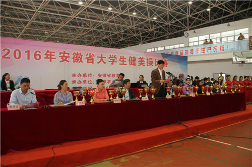 本网讯 4月30日上午,由安徽省教育厅主办、安徽农业大学承办的2016年安徽省大学生健美操比赛正式落下帷幕。副校长韩军、安徽省教育厅体育卫生艺术教育处处长宣进出席闭幕式,校办公室、宣传部、团委、体育部等单位负责同志以及本次赛事的裁判长参加闭幕式,闭幕式由陈有忠主持。