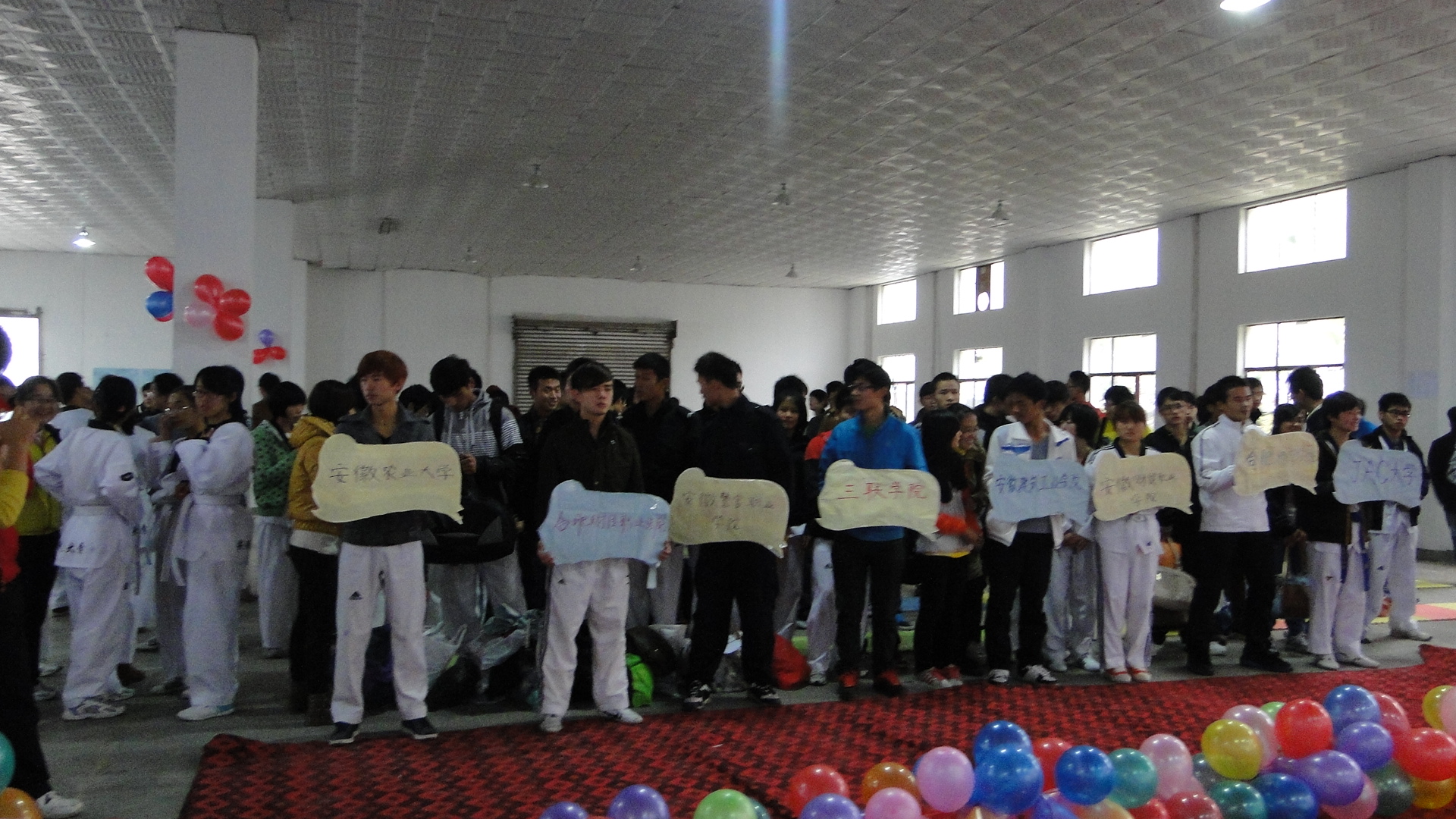 本次比赛在筹备阶段得到了校体育部陈有忠主任及彭景强老师的大力支持,在比赛当天也拥有较强的老师裁判阵容,安徽建筑工业学院跆拳道指导老师李平,我校体育部张玉强老师、毛迪老师、王莹老师亲临现场作为裁判员,为参赛人员了提供一个公平公正公开的比赛平台。比赛共有12个学校参赛代表队:安农大、合工大、安大、安建工、合肥师范学院、三联学院、警官学院、财经学院、财贸学院、涉外学院、安中医、jac大学,共110余名参赛人员。吸引的流动观众人员保持在200余人。比赛场面宏大壮观,赛台上双方交锋激烈,扣人心弦。