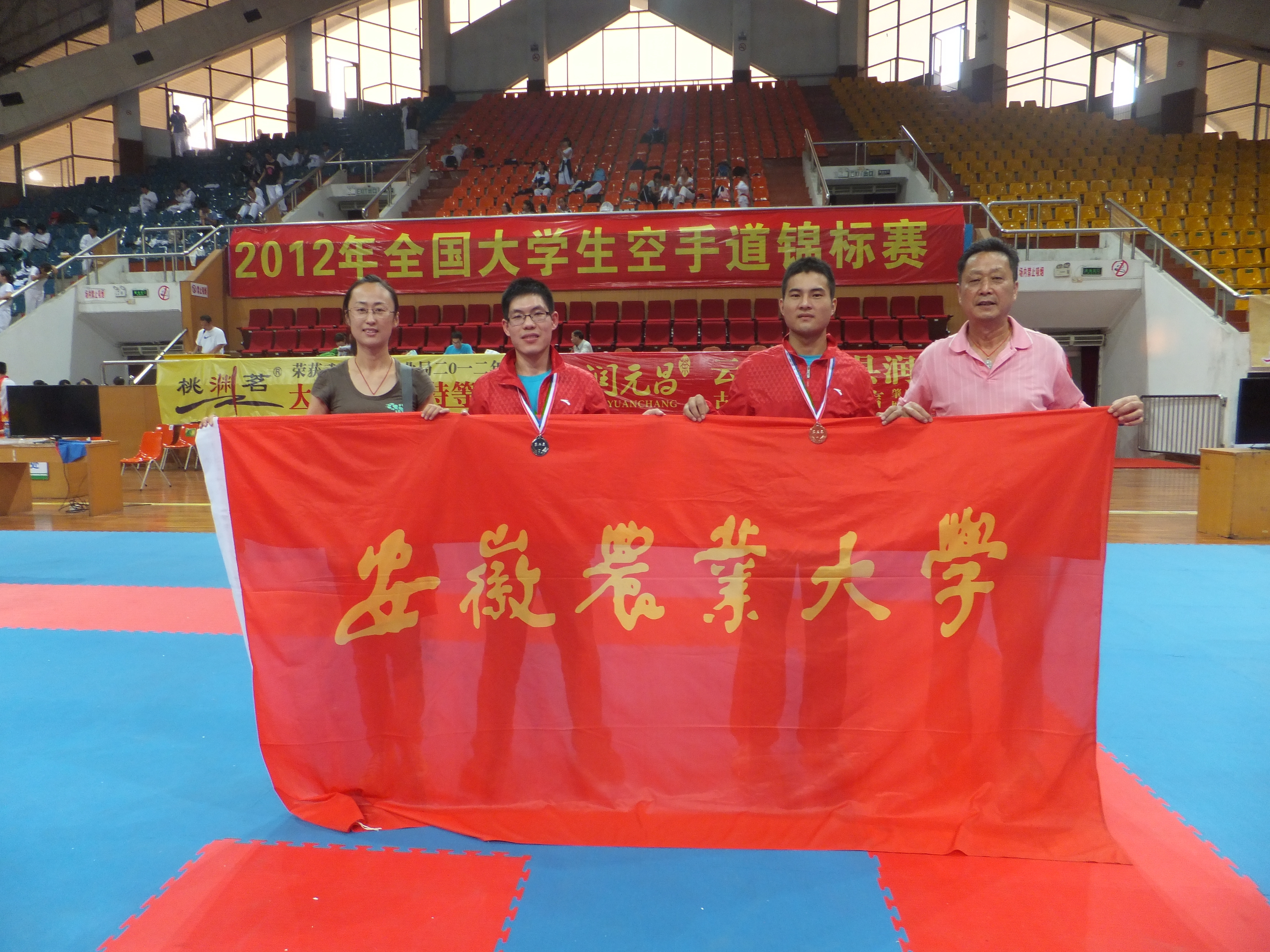 我校刚组建空手道队不久,首次参加大学生锦标赛,我们派出了张广权和赵维松两名队员,在赛场上他们不畏强敌、稳扎稳打、过五关斩六将,努力拼搏,在教练洪晓波的带领下,在比赛上崭露头角,获得了两枚铜牌和两个第五名的好成绩,张广权同学还获得了“体育道德风尚优秀运动员”的称号,他们为农大争得了荣誉,这个成绩也是对他们长期以来艰苦训练的肯定,我们为他们喝彩、为他们骄傲。希望他们戒骄戒躁,在今后的训练中更加努力,取得更好的成绩。