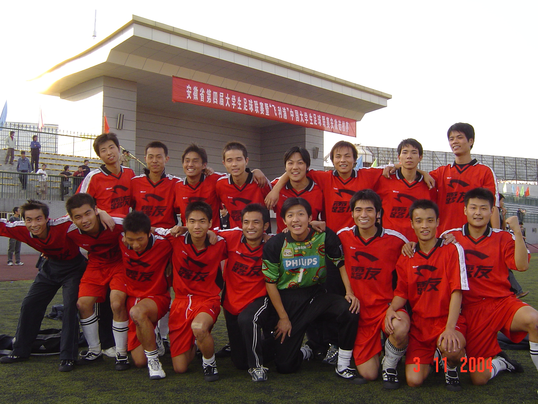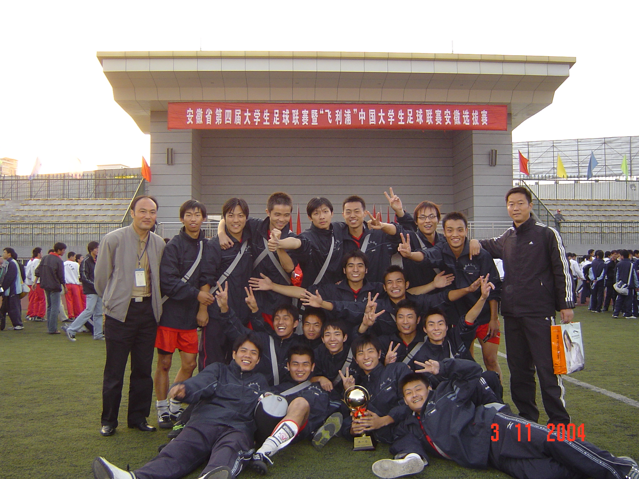 今天下午2:00,在中国科大赛场,我校足球队与安徽工业大学队展开了冠亚军之战,经过90分钟激战,两队以1:1战平,在最后的点球大战中,我校足球队终以6:5险胜安徽工业大学队,继2001年获得安徽省大学生足球赛冠军后,再次登上冠军宝座。