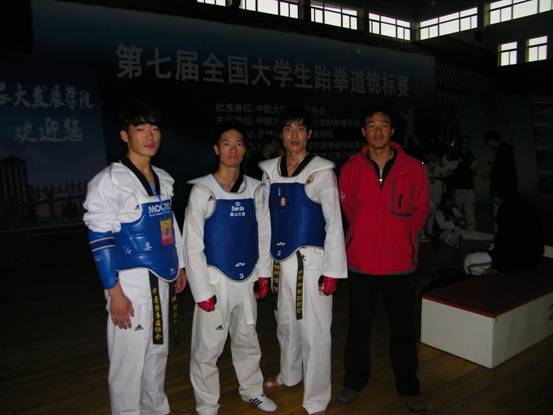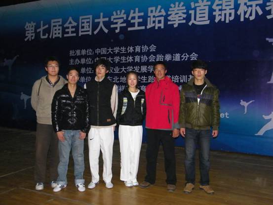 10月30日至11月1日,由中国大学生体育协会跆拳道分会主办的“第七届全国大学生跆拳道锦标赛”在吉林农业大学发展学院体育馆隆重举行,来自全国各地的82支队伍(含香港1所)846人参加了比赛,我校选拔出5位同学代表参加了比赛,最终我校跆拳道队队员经过多轮单败淘汰赛,茶与食品学院2010级关博文同学获得竞技男子个人银牌,林学与园林学院2009级朱丹青、轻纺工程与艺术学院2010级翟国庆、资源与环境学院2009级聂贵林都获得了竞技个人第5名,翟国庆、聂贵林、轻纺工程与艺术学院2009级孟兵组成的竞技男子团体获得铜牌,同时我校代表队获得“精神文明运动队”称号。