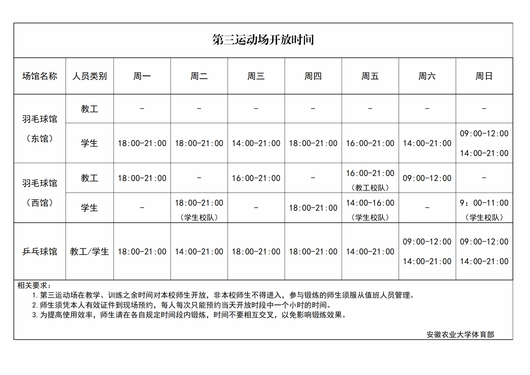 为了满足我校师生健身需求,自2024年4月7日起,在保障教学和校队训练基础上,校第三运动场羽毛球馆、乒乓球馆对我校师生定时分段免费开放,具体安排如下:
