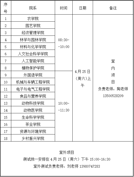 5、参加测试人员应按照统筹安排的时间进行测试,如在规定时间内因身体等特殊原因无法按时完成测试者,请及时与负责老师联系。