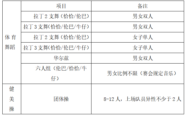 4.体育舞蹈、健美操可互相兼报,健美操、六人组不受报名项数限制。