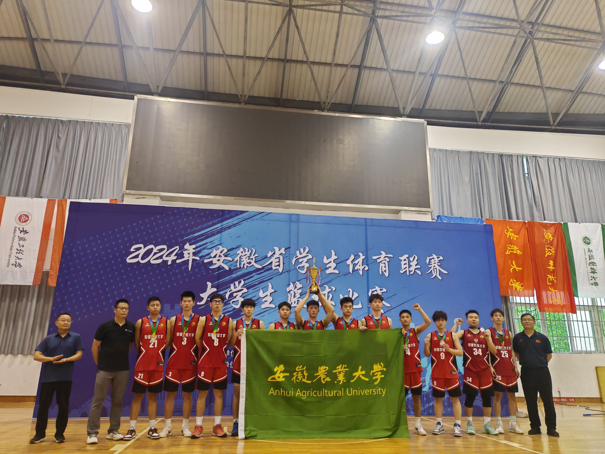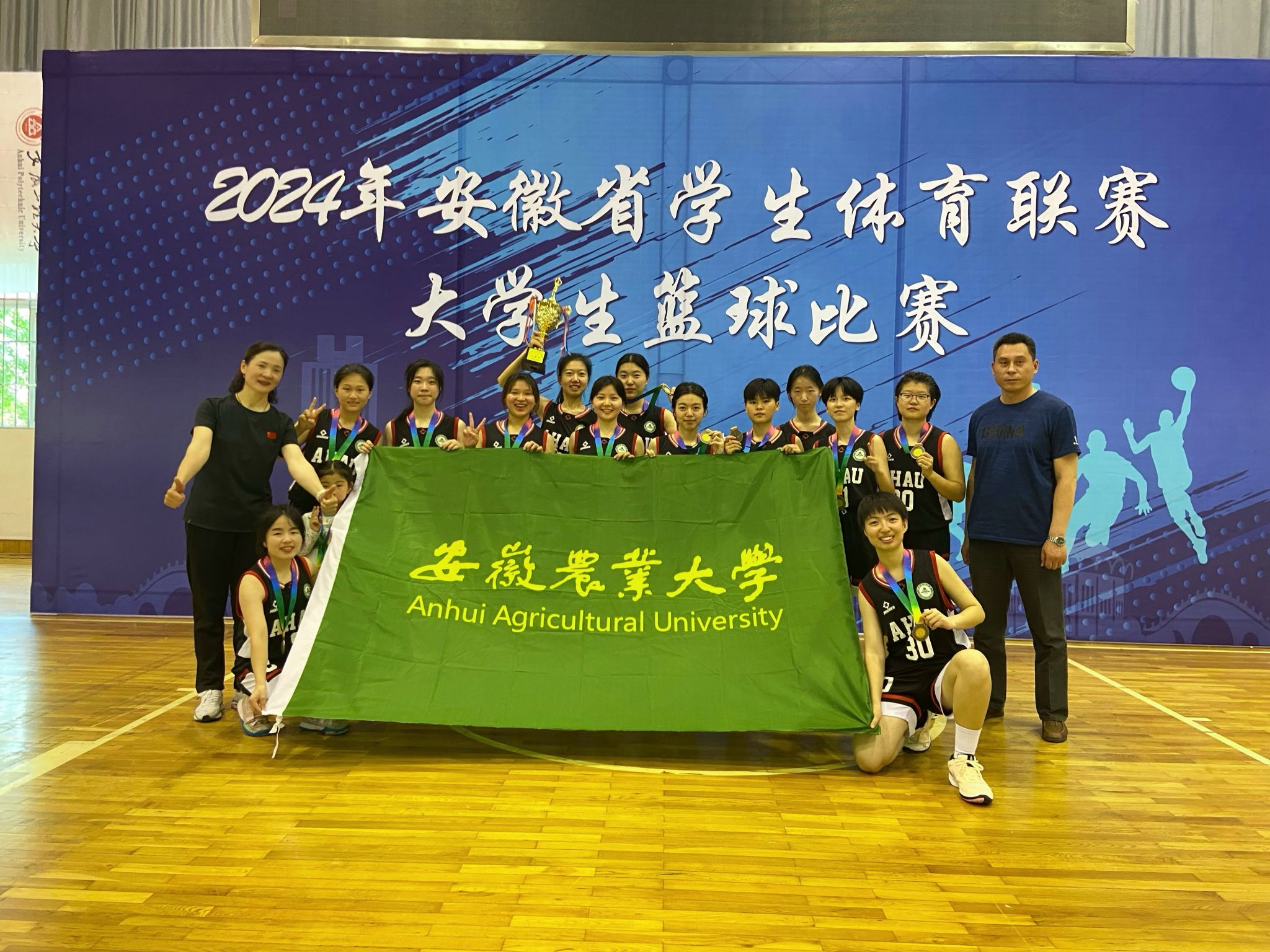 本网讯 由安徽省教育厅、安徽省体育局主办,安徽工程大学、安徽农业大学、安徽省学校体育协会承办的2024年安徽省学生体育联赛大学生篮球比赛于5月9日至25日分别在芜湖和合肥举行,经过多轮激烈角逐,最终我校男子篮球队取得男子甲组亚军,女子篮球队取得女子甲组季军的优异成绩。