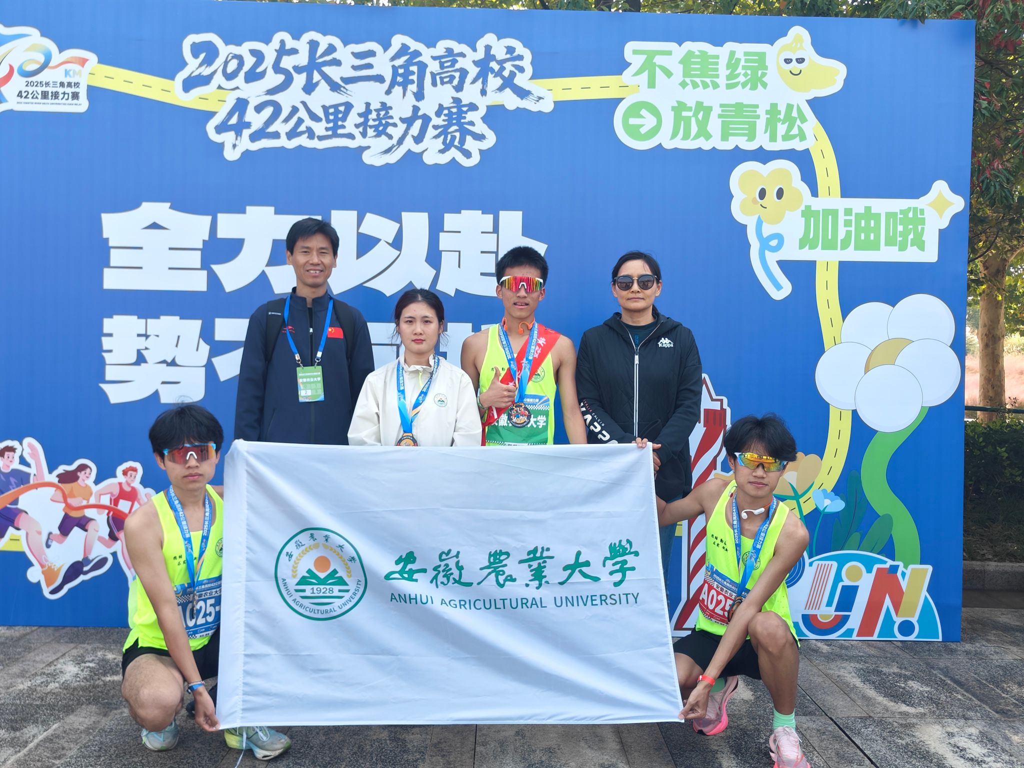 本网讯 11月2日,2025长三角高校42公里接力赛在南京市建邺区江心洲鸣枪开赛。我校田径队童军、蒋云、李翔、孙文亮四名队员在教练王静老师的带领下,顽强拼搏、迎难而上,获得总排名第16名,安徽省排名第3名的优异成绩。