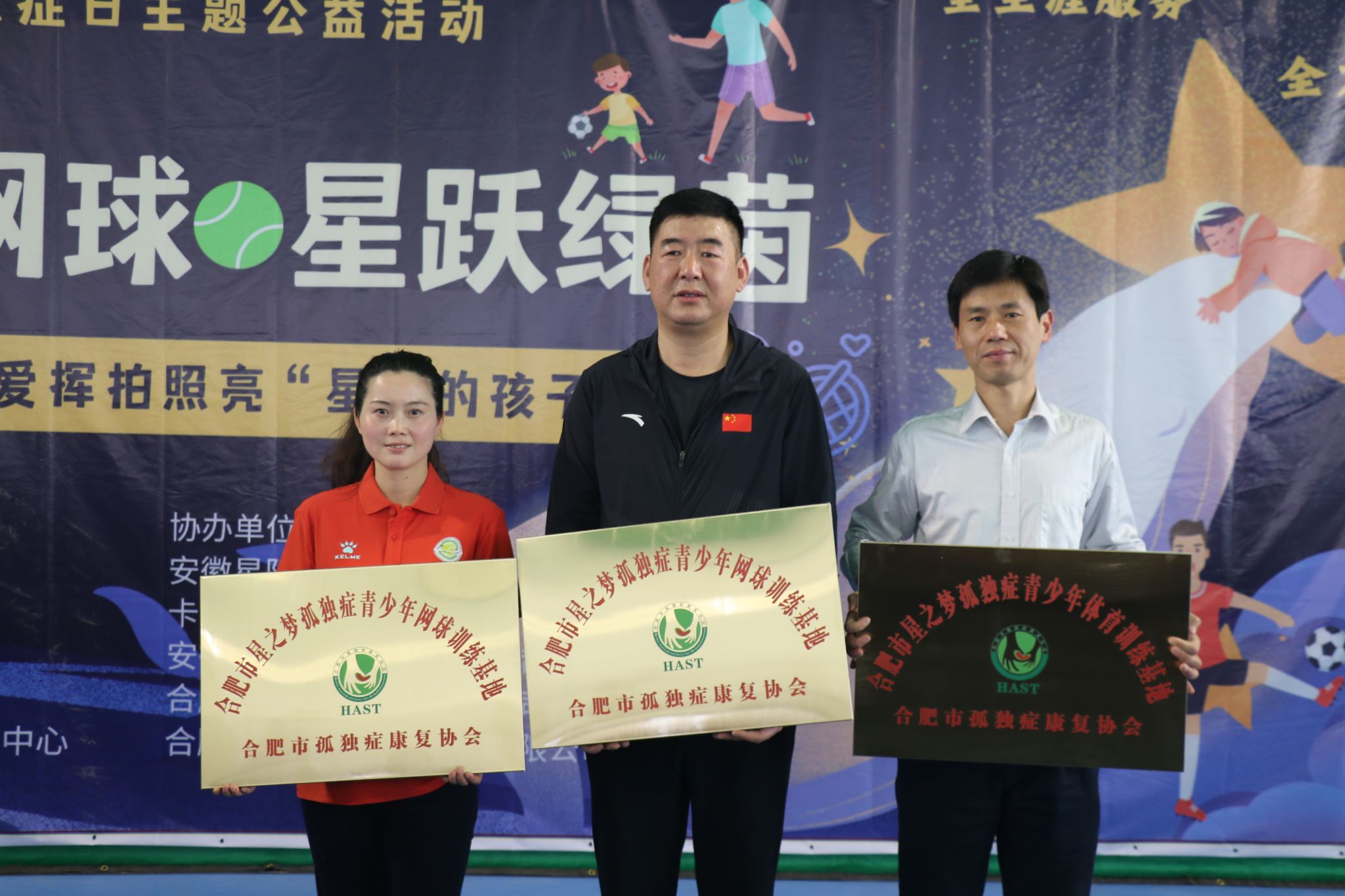 活动中,各位嘉宾和爱心人士为孤独症儿童赠送了体育运动器材和纪念品。安徽农业大学被合肥市孤独症康复协会授予“星之梦孤独症青少年网球训练基地”。